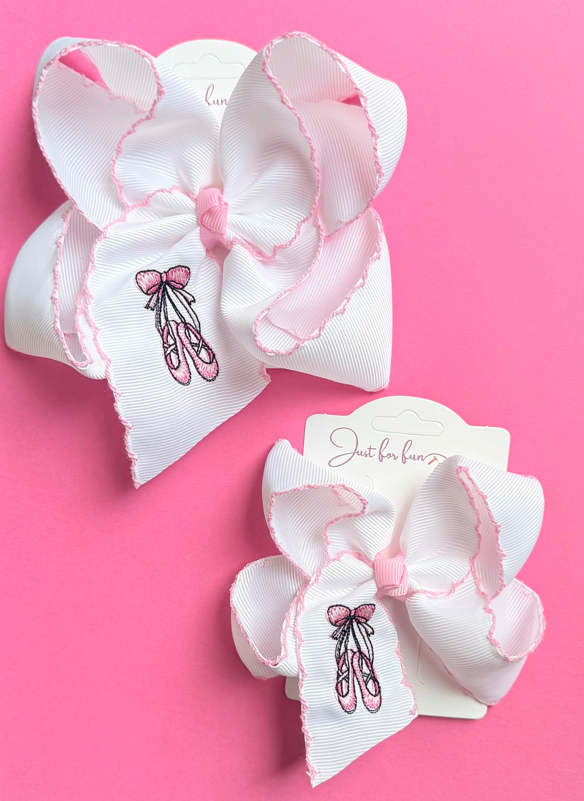 Let her dance through the day in style with our Ballet Shoes Embroidered Hair Bow! Featuring dainty ballet slippers stitched onto crisp white ribbon with signature moonstitch trim, this bow is made for little dancers and big dreams.
