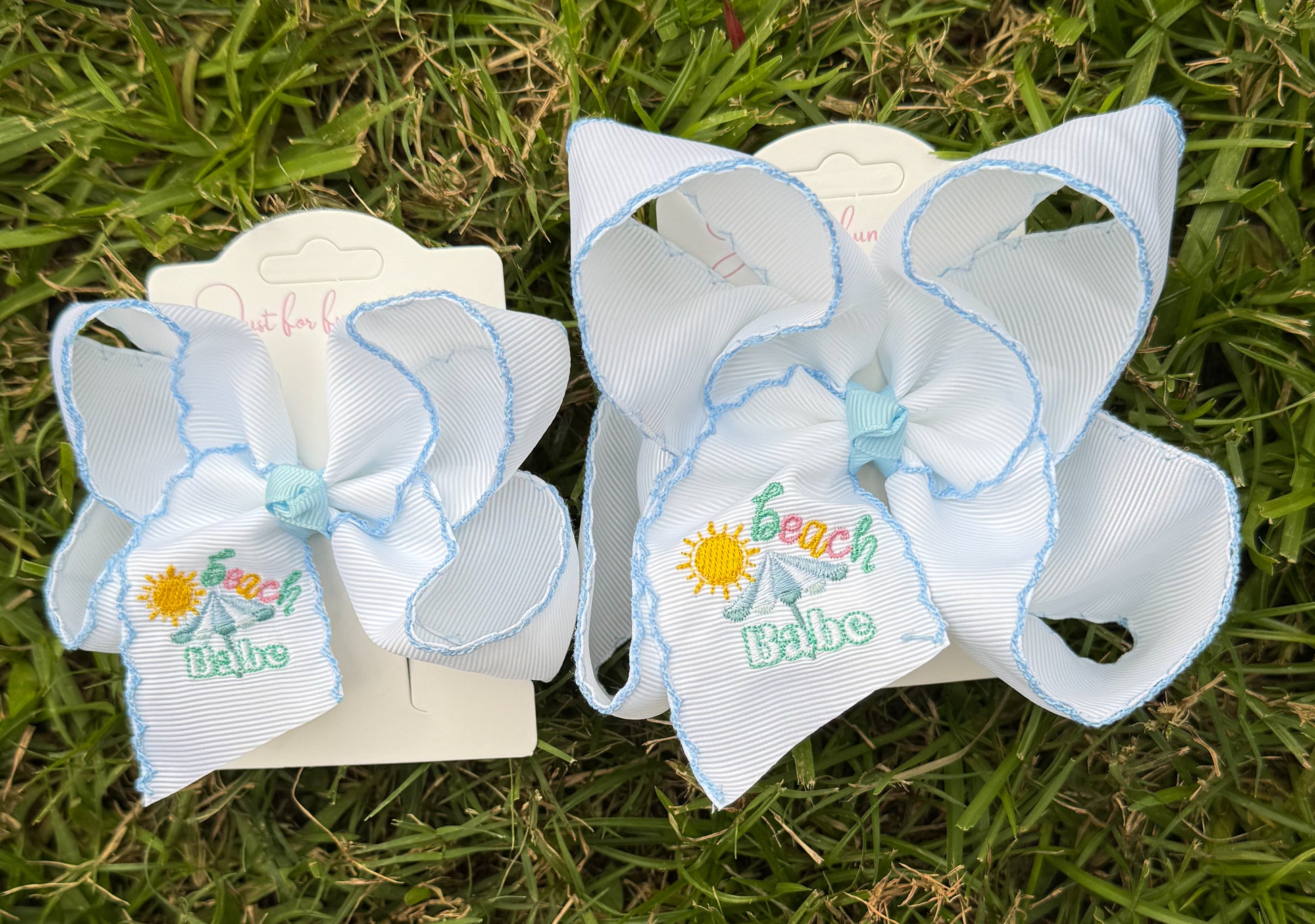 Bring on the beachy charm with our 4-inch “Beach Babe” embroidered hair bow! Designed with a playful Moonstitch trim and vibrant seaside embroidery, this smaller-sized bow is perfect for toddlers or those who prefer a more subtle splash of summer style.