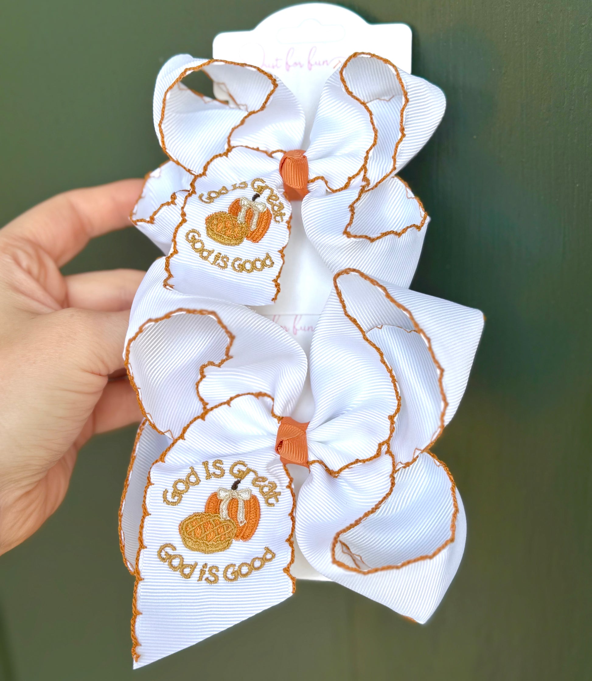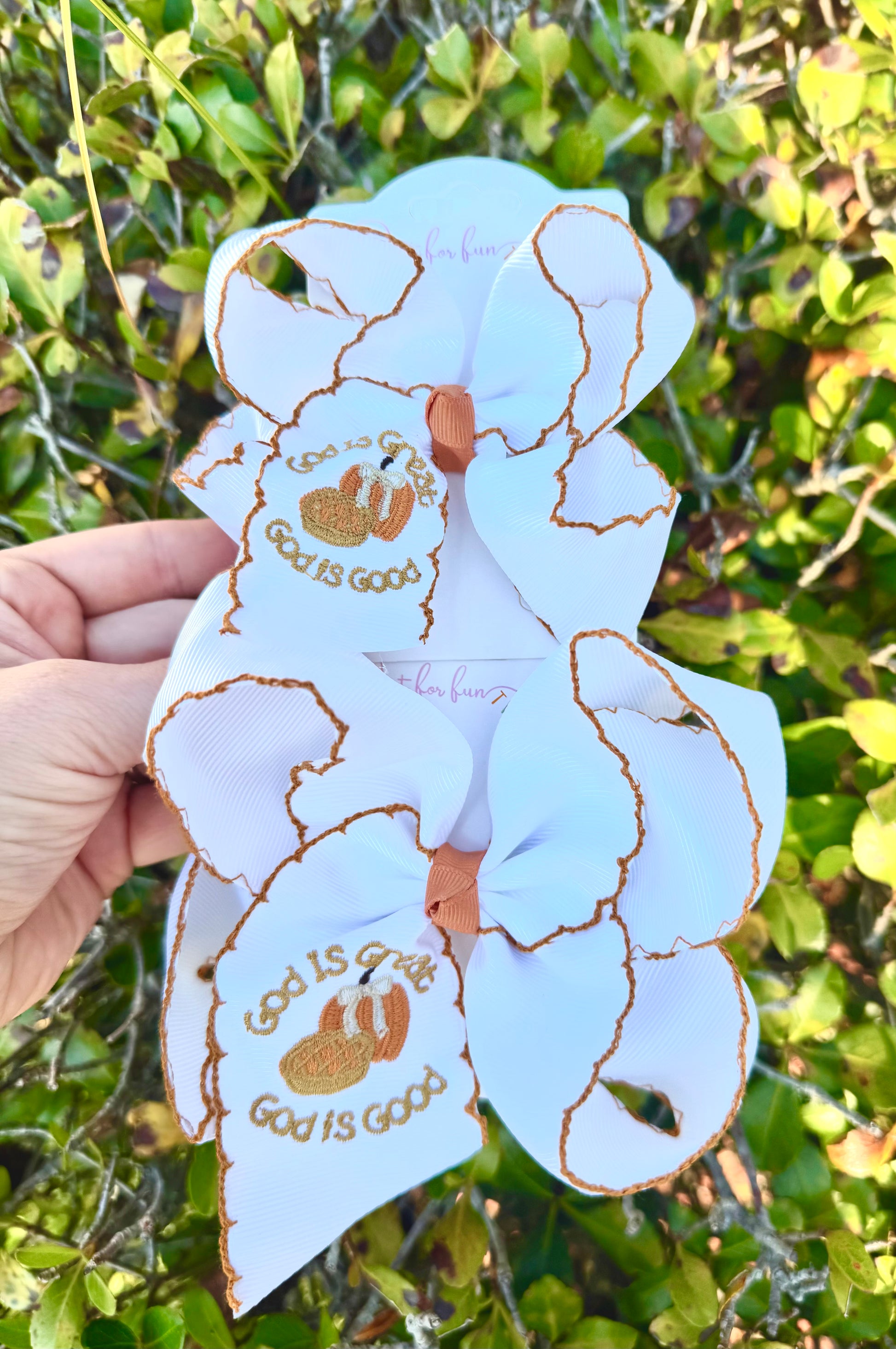 A sweet reminder of faith + fall. White grosgrain with orange moonstitch trim and embroidered pumpkins make this bow perfect for church, Thanksgiving, and every day. Available in 4in and 5.5in.