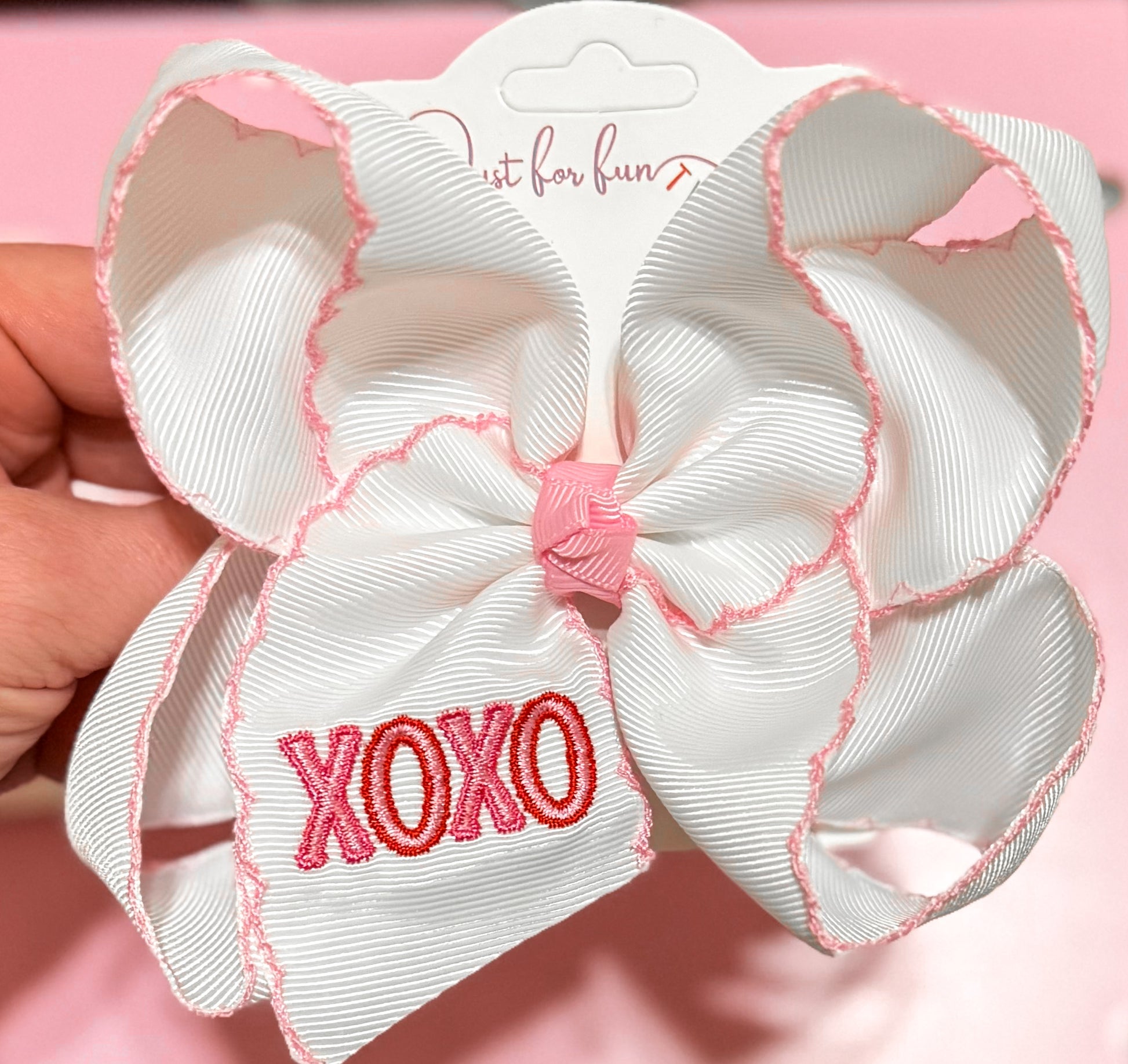 Sweet, simple, and full of love — our embroidered XOXO Moonstitch Bow is the perfect pop of charm for any outfit. Each bow features delicate stitched XOXO lettering paired with our signature moonstitch trim, giving it that classic boutique look mamas adore.